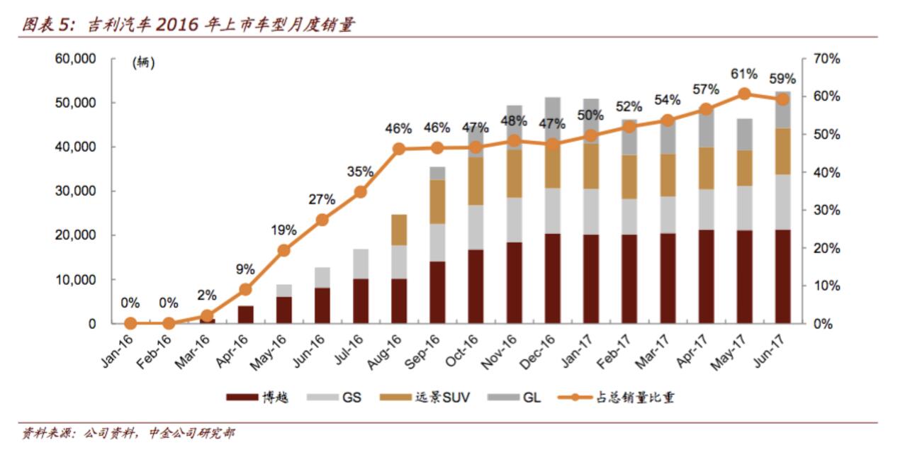 在较严峻的市场环境下,吉利汽车取得好成绩原因主要在两点,一是去年下半年公司上线的博越等次新车型表现仍较突出,二是产品组合改善,带动公司均价和盈利毛利率改善。