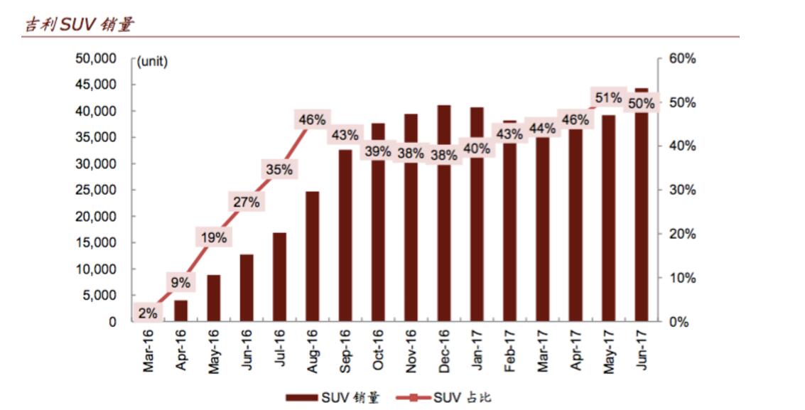 其次,来看吉利汽车产品组合的改善。吉利汽车现有轿车车型在今年上半年持续,而博越等SUV新车型带动产品结构改善,平均售价也有所提升。数据显示,吉利汽车上半年SUV的占比从去年同期的14.6%提升至今年的45.7%。兴业证券认为产品结构优化带来双重利好,一是带动整体均价提升,二是提升盈利能力水平。该行预计吉利汽车上半年整体均价较去年同期上升17.6%至7.38万元;预计上半年的毛利率较同期提升1.9个百分点至19.6%。