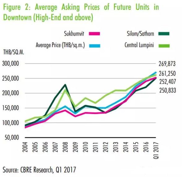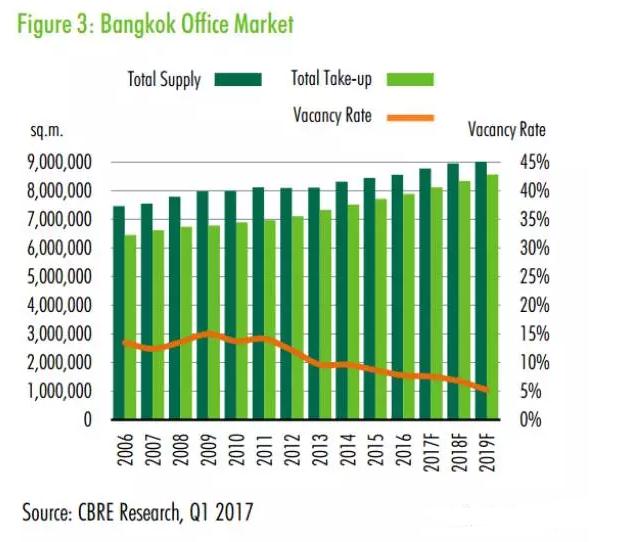 在第2017年平均甲级CBD写字楼租金环比上涨1.6%至968泰铢/平方米,至2017--2019年建设中由于供应有限,供应紧张的市场状况导致强劲的预期需求,写字楼价格将调至约400000泰铢/m²。
