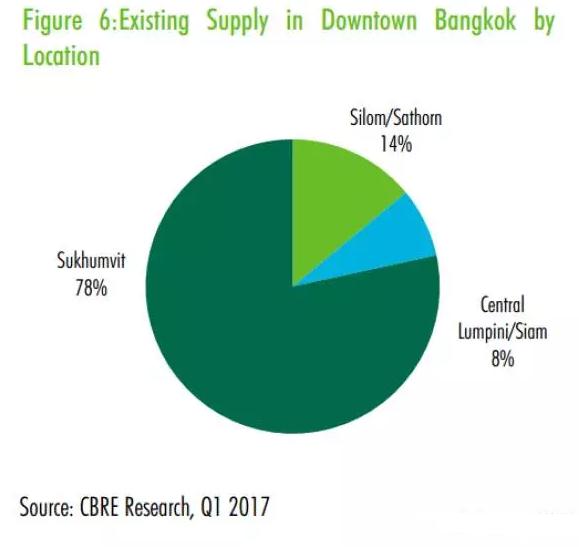 在第2017第一季度中,曼谷公寓供应在市中心区的建筑物总计约10510个单位,同比降低5%,这是由于市场基于在曼谷市中心的城市规划,以及移除一些公寓正在翻新或关闭。未来高端的公寓供应非常有限。此区域中只有500套公寓正在计划或建设中。在曼谷中,外籍人士持有工作许可证的数量增加了0.5%,同比增长2.1%,中国人(13%)在曼谷目前属于持有工作许可证的数量排名第二的外籍人士,而日本外籍人士如今是最大比例,在此中,中国人在曼谷买房的预算低得多,2017年第一季度的入住率为95.9%,增加0.5,同比增加了0.8个百分点。甲级公寓租金曼谷市中心是453泰铢 /m²/月;Lumpini 以及siam区域仍然是最高租金,甲级写字楼租金水平481 /m²/月。
