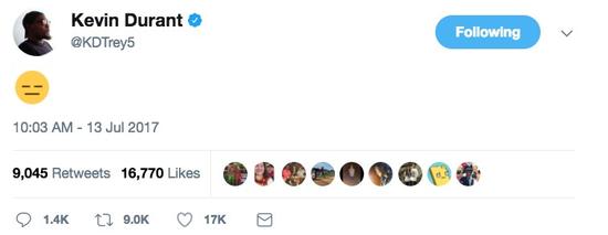 典礼上,杜兰特获得了年度最佳冠军表现奖,但他还是在推特上发了一个尴尬的表情。
