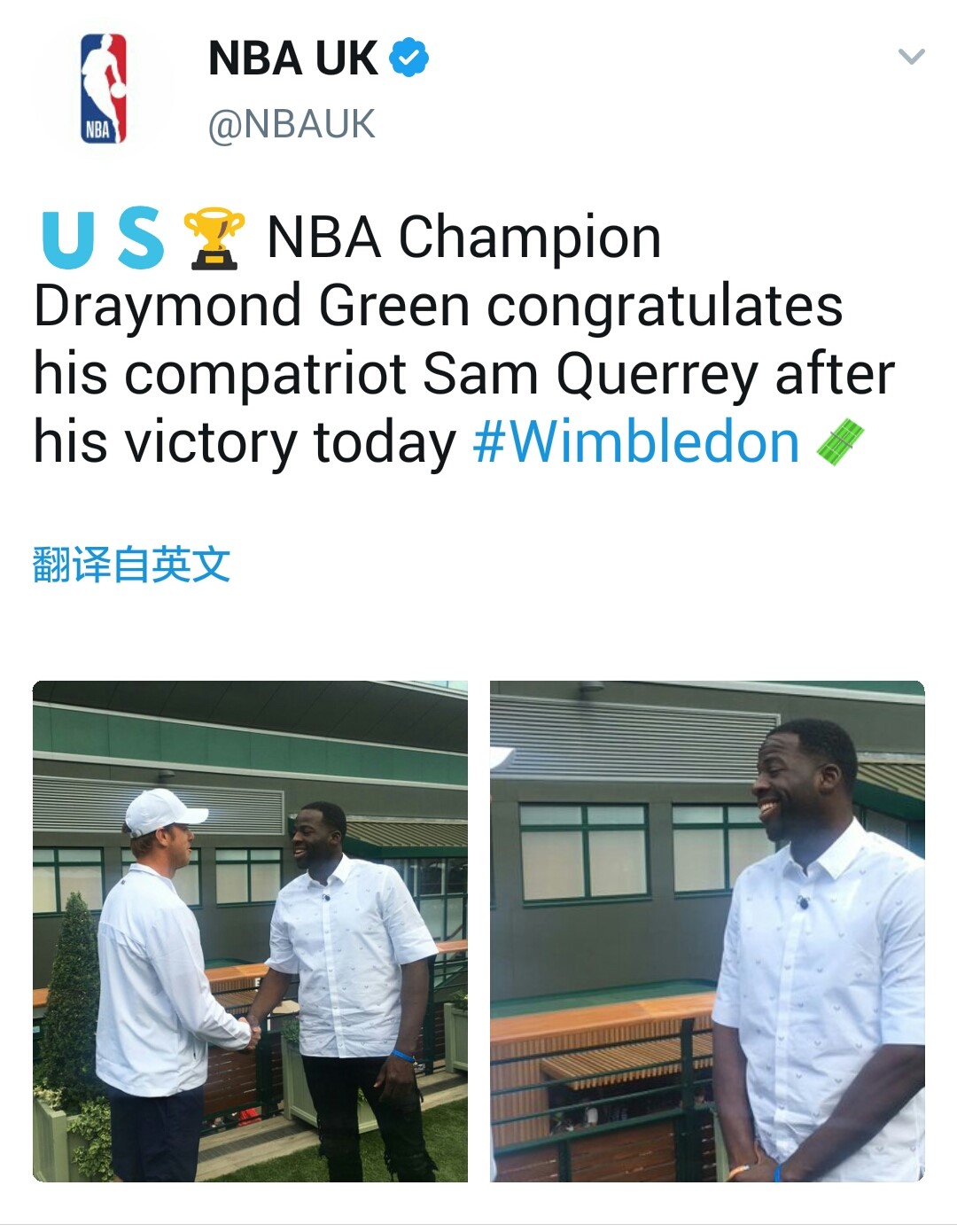 在刚结束的温网男子单打四分之一决赛中,美国大炮奎雷伊逆转击败卫冕冠军、世界排名第一的穆雷,职业生涯首次挤进大满贯四强。而金州勇士的球员德雷蒙德•格林到场观看了比赛,并在赛后祝贺了同胞的成绩。