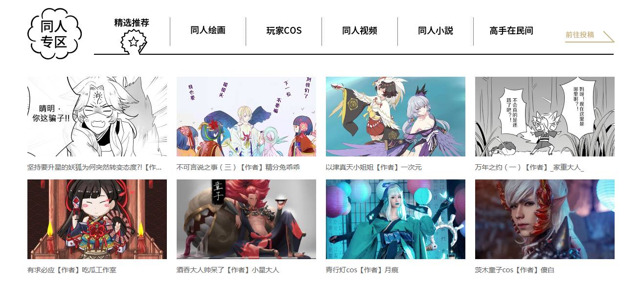 在《阴阳师》正式上线后,官方还相继举办了各种同人比赛,形式包括图画、配音、音乐、Cosplay甚至MMD;玩家也可在游戏里上传自己制作的同人表情包。而在《阴阳师》游戏官方网站,还有专门的同人板块,囊括绘图、COS、视频、小说等等。《阴阳师》的同人圈子在官方的推动下迅速发展,无论是不是《阴阳师》的玩家,都不可避免在各种社交软件上看到它的相关同人,对游戏的推广起到了极大的作用。