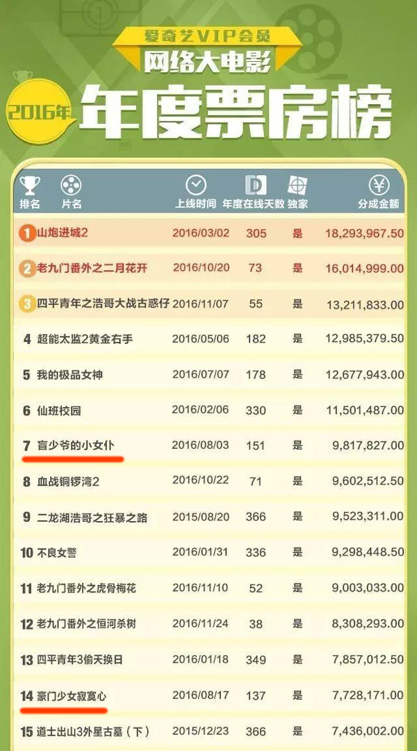 不光是这个系列,他们的每部片子都能挣钱。去年爱奇艺年度分账Top20榜单里,有两部他们的作品。