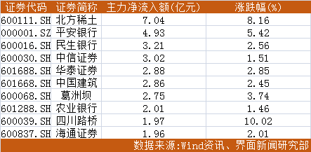 盘中多只金融股获主力资金追捧。平安银行(000001.SZ)领衔民生银行(600016.SH)、中信证券(600030.SH)、华泰证券(601688.SH)、农业银行(601288.SH)、海通证券(600837.SH)等六家银行、券商股上榜两市净流入个股前十,其主力净流入分别为4.93亿元、3.21亿元、3.02亿元、2.88亿元、2.01亿元、1.96亿元。此外,今日北方稀土(600111.SH)获主力资金青睐,凭借7.04亿元的主力净流入获两市个股第一。