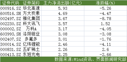 华北高速(000916.SZ)、方大炭素(600516.SH)、雅化集团(002497.SZ)成为主力净流出最高的三只个股,分别为5.93亿元、4.69亿元、3.67亿元。值得注意的是,界面新闻今日中午报道的雅化集团消息发酵,雅化集团午后遭遇重挫,盘面急速跳水后一度跌停,后收跌8.78%,报11.33元/股。