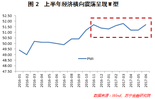 (1)上半年股票和主要商品基本进入宽幅震荡格局,因为上半年我国经济也是高位震荡走势。比如观察PMI指标,从2016年11月开始呈现W走势,高点依次出现在2016年11月、2017年3月和2017年6月,读数分别为51.7、51.8和51.7,可以发现上半年PMI没有持续创出新高,基本上横向震荡(参见图2)。在这种环境下,股票和商品也跟随经济大体呈现宽幅震荡的格局。