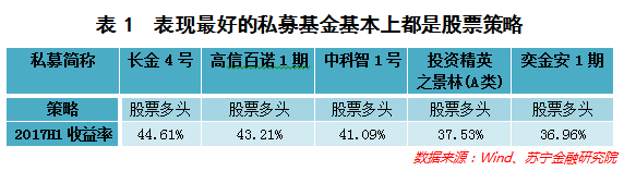 (1)虽然从平均来看,上半年股票多头策略的收益率只有5.25%,但实际上表现最好的股票型私募基金上半年的收益非常可观。笔者把跟踪的私募基金上半年的收益做一个排名,发现收益前五名的私募基金全是股票策略,表现最好的是长金投资的长金4号私募基金,上半年收益率高达44.61%(参见表1)。