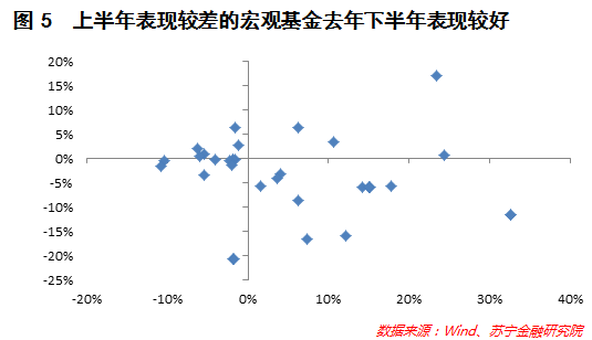 (3)上半年宏观策略基金表现较差,与部分宏观基金净值大幅下滑拖累了整体表现有关。实际上,上半年笔者跟踪的宏观策略私募的收益率在-21%至17%之间,并且超过1/3的私募收益率低于-5%。由于理论上宏观策略私募可以投资股票、债券、商品等所有市场,使得分析宏观策略私募的持仓变得有些困难。但大体上可以推断,上半年表现较差的宏观策略基金与持续投资CTA策略有关,因为今年上半年表现较差的宏观基金普遍在去年下半年取得了不错的收益,而只有CTA策略在去年下半年表现好、今年上半年表现差(参见图5)。
