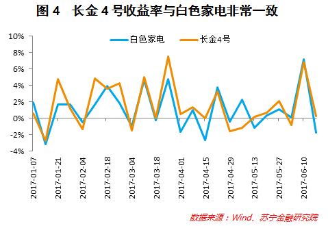 通过分析可以发现,长金4号的收益率与白色家电的收益率走势极为一致,上半年两者的相关系数高达0.81,由此推测长金4号配置了相当大一部分的家电股(参见图4)。实际上,A股上半年消费类的家电和白酒表现一枝独秀,买入消费类的公募基金的收益率并不会比排名前五的私募基金差太多。