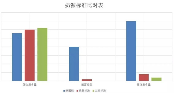纵观三大指标,三元的原奶标准控制达到了非常优良的水平:蛋白质含量达到甚至超过3.1克/100克(“新国标”为2.8克/100克,欧盟标准为3.0克/100克);菌落总数低于1万个/毫升(“新国标”为200万个/毫升,欧盟标准为10万个/毫升);体细胞含量低于20万/毫升(“新国标”对此没要求,欧盟、澳洲标准为40万/毫升,美国标准为75万/毫升)。奶源上,三元标准彻底碾压欧盟,更是将“新国标”远远甩在后面。