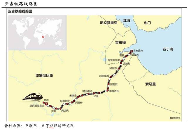 亚吉铁路是东非第一条电气化铁路,是继坦赞铁路之后,中国在非洲修建的又一条跨国铁路,目前已成为以货运为主、客货列车共线运行的,横跨埃塞俄比亚和吉布提两国的骨干铁路。亚吉铁路西起埃塞俄比亚首都亚斯亚贝巴,途经重要城市阿达玛、德雷达瓦,东到吉布提港,全长约752公里,采用中国二级电气化铁路标准建设。设计客运时速120公里、货运时速80公里,共分布45个车站,初期运能设计为600万吨/年,远期通过复线改造可将运量提升至1300万吨/年。项目总投资约40亿美元(含机车车辆采购)。