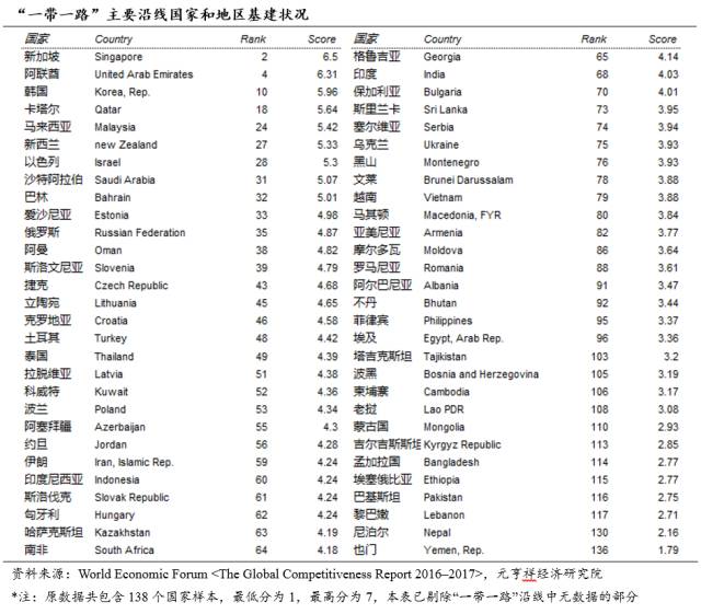 “一带一路”沿线国家和地区基础设施建设水平整体滞后,基础设施建设将是“一带一路”沿线最基本、最迫切的需求。基础设施是居民和企业进行生产经营工作和生活的共同物质基础,是城市主体设施正常运行的保证。根据世界经济论坛发布的《全球竞争力报告2016–2017》中显示,“一带一路”主要沿线国家和地区基建水平分层现象明显,同时在全部138个样本国家中,为数不少的“一带一路”沿线国家和地区,元立方金服研究人员发现,主要是中低收入国家——基建水平排名靠后,显示其基础设施建设发展滞后。基础设施建设具有所谓“乘数效应”,能带来几倍于投资额的社会总需求和国民收入,“一带一路”沿线国家要实现经济长期持续稳定发展,基础设施建设将是重要物质基础。