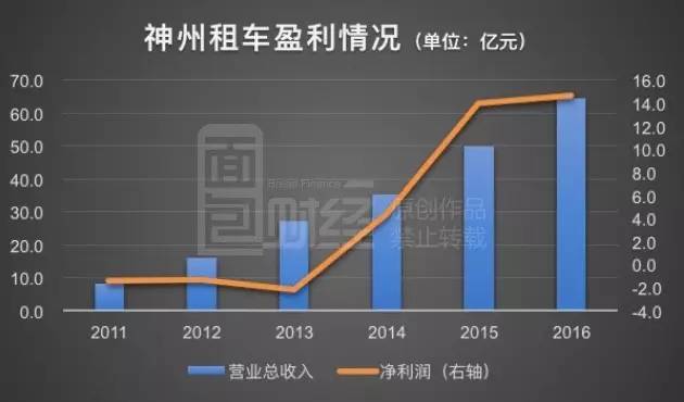 神州租车的营业收入从2011年的8.2亿元增长到2016年的64.6亿元,年复合增长率超过50%。而上市之前的净利润一直为亏损状态,2013年亏损1.5亿元,但是在2014年获得了4.4亿元的净利润,2016年净利润则增长到14.6亿元。