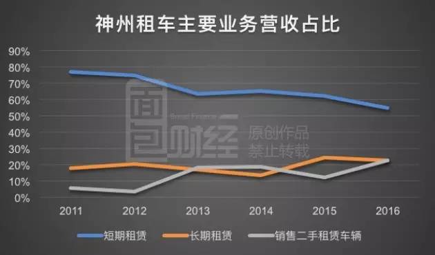 神州租车主营业务主要为短租、长租和二手车销售,2016年长租车业务营收占比为22%,相较2011年的5%占比增长很多,与此同时作为神州租车一直以来首要业务的短租业务营收占比却一直在下滑,从2011年的77%下降到2016年的55%。