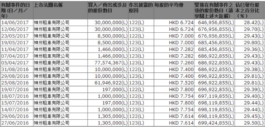 巧合的是,陆正耀在神州租车回购模式开启之后不断减持,下表为面包财经截自港交所的数据: