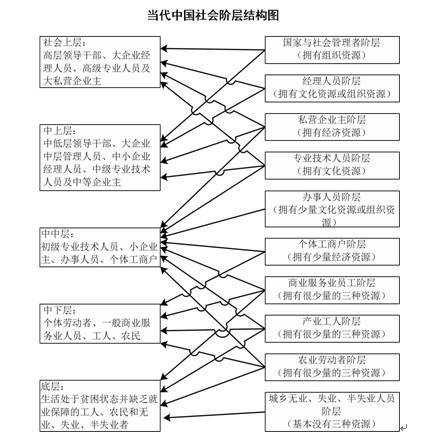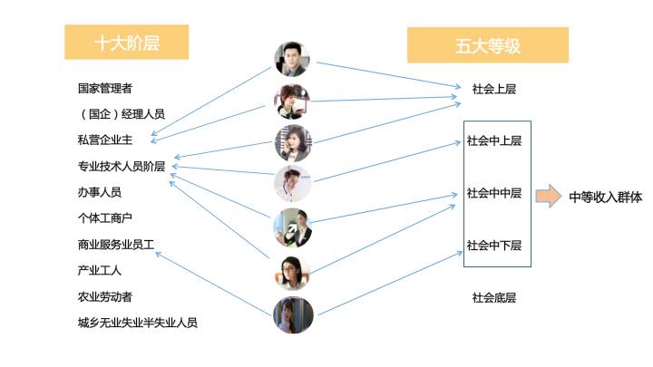 反观中国的阶层划分,相对剥离西方语境的经典框架来自于陆学艺等中国学者。他们以职业为基础,围绕人们社会资源支配能力、经济收入和知识技能等指标,提出了中国社会的“十大阶层”划分。(如下图所示)