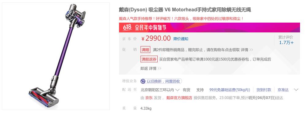 (戴森手持吸尘器在京东已有超过1.7W条评价)