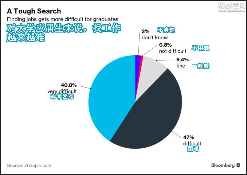 据彭博社报道、智联招聘《2017应届毕业生就业力调研报告》显示,2017年应届毕业生中,近九成表示找工作困难,超四成认为找工作“非常困难”。即便对于那些已经找到工作的大学生,其工作也往往不够理想,近四成毕业生找到的工作专业不对口:而从月薪来说,实际签约薪资大于等于期望的大学生仅占24.2%,实际小于期望的占75.8%。