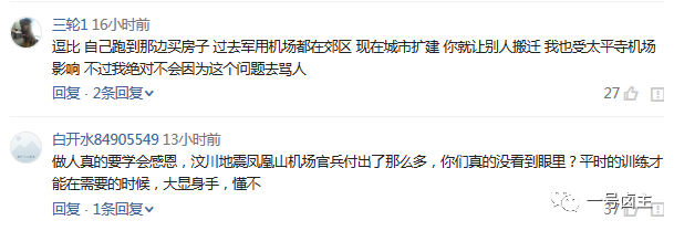 三轮1:逗比,自己跑到那边买房子,过去军用机场都在郊区,现在城市扩建,你就让别人搬迁,我也受太平寺机场影响,不过我绝对不会因为这个问题去骂人。