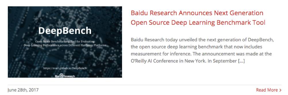 正如他们自我介绍里所说,百度在硅谷的 AI Lab 专注于深度学习技术与国内较为知名的深度学习实验室(IDL)功能类似。百度硅谷 AI Lab 在学术研究上较为活跃,经常在官方博客上介绍最新研究,比如最新的深度学习基准工具 DeepBench。DeepBench 是一种深度学习基准工具,用来评估深度神经网络训练中的基础操作的表现,现在已经开源。