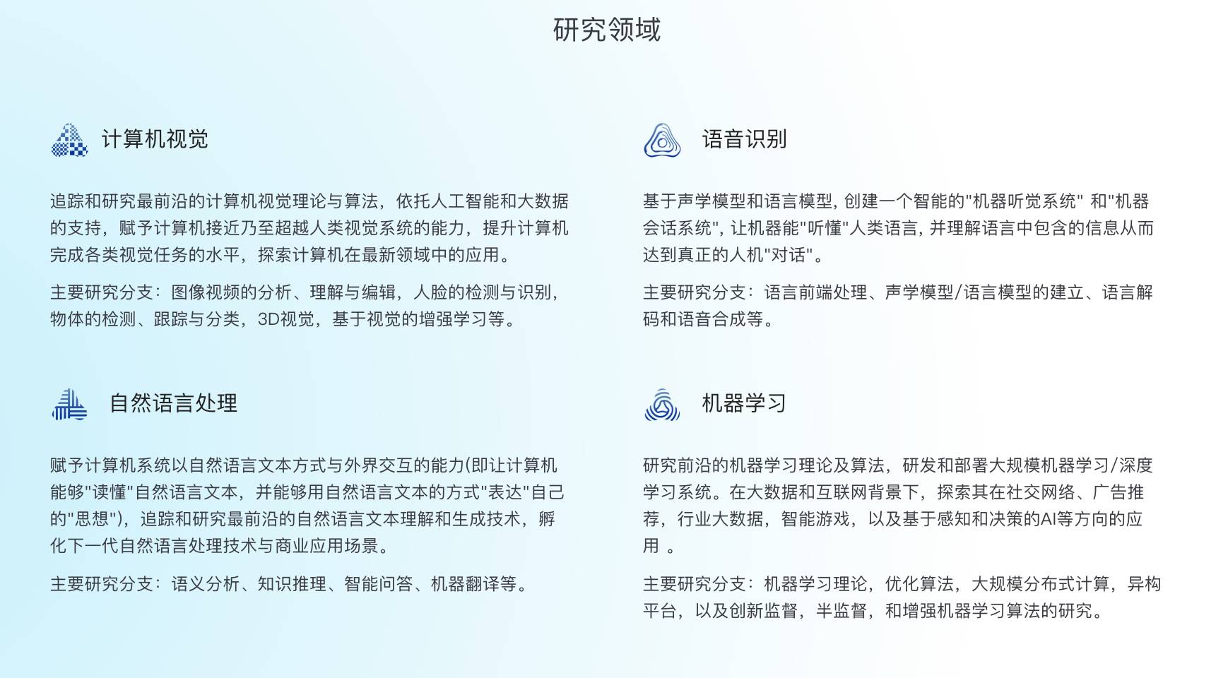 研究领域:在腾讯 AI Lab 官网上,列出了四个研究领域:计算机视觉,语音识别,自然语言处理和机器学习。这四方面的技术将支撑 AI Lab 朝上述研究方向行进。