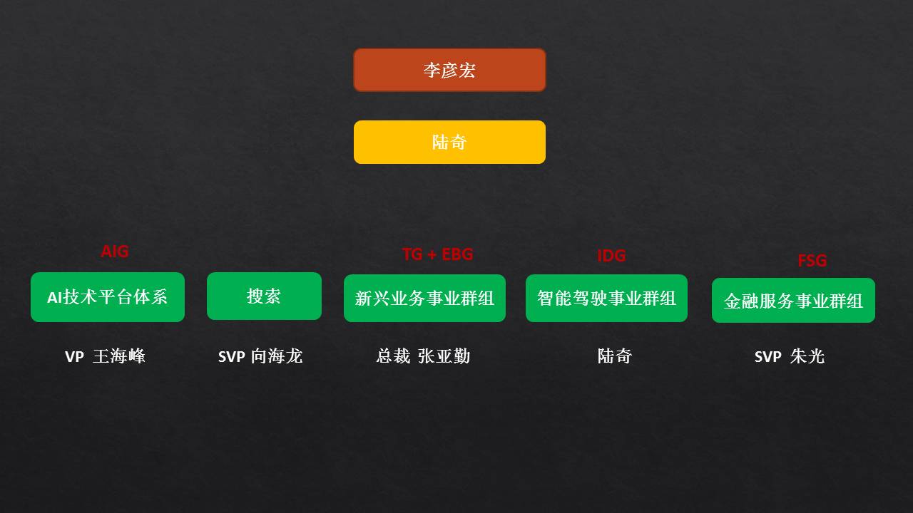 陆奇的五大业务体系中,除了AI技术平台(AIG)外,还有搜索、新兴业务事业群组、IDG(智能驾驶事业群组)和FSG(金融服务事业群组)。