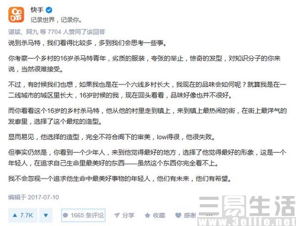 快手的解释是:“一个乡村的16岁杀马特青年,劣质的服装,夸张的举止,惊奇的发型,对知识分子的你来说,当然很难接受”,但是如果考虑到个人的生长环境,一个六线乡村长大的孩子自然不可能和一二线城市城区的孩子有着一样的审美品位,可是在这个杀马特青年的认识世界里,这是他所感受到的最炫最时尚的造型,“这是一个年轻人,在追求自己生命里最美好的东西”。
