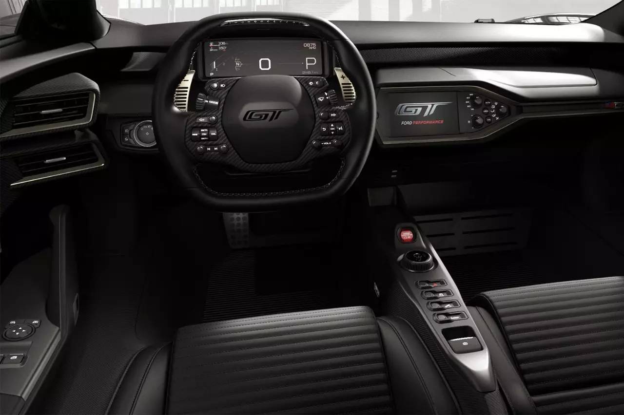 内饰?啊哈~不知道是福特在传承不舍得花钱在内饰的作风,还是为了坚持美式跑车粗犷简朴的风格,总之觉得和现代欧洲超跑不是同一个年代的。除了碳纤维饰板,整个中控造型方方正正,硬质材料几乎铺满整个驾驶位,一个如大饼般的方向盘上,密密麻麻布满各种按键。依我说,这套内饰其实比超跑的更有深度,已经从跑车上升到赛车的层面了。