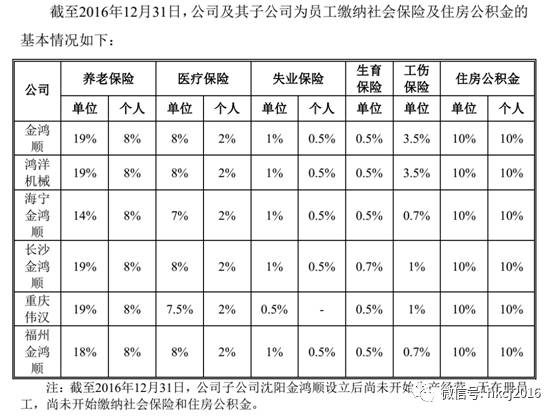 从“真相”来看,2016年顺子家各个子公司“五险一金”的单位缴纳比例并不相同,简单相加并取整的话,单位缴纳比例最高的是“金鸿顺”和“鸿洋机械”两家子公司,其缴纳比例合计为42%。缴纳比例最低的则是子公司“海宁金鸿顺”,合计比例仅为33%。而“长沙金鸿顺”、“重庆伟汉”和“福州金鸿顺”的合计比例则分别为40%、39%和38%。