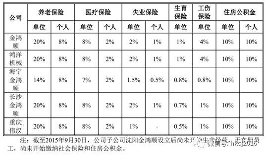 简单相加取整后,单位缴纳“五险一金”的总比例中,“金鸿顺”和“鸿洋机械”均为为45%,比例最高,而“海宁金鸿顺”为34%,比例最低。“长沙金鸿顺”和“重庆伟汉”则分别为42%和41%。显然,2015年中,相比几家子公司,金鸿顺实际缴纳比例还是最“矮”的。