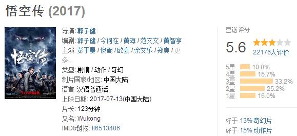 连续两个工作日票房过亿,由此可见《悟空传》的吸金能力,只是,与高票房形成鲜明反差的是,《悟空传》在多个专业评分上的口碑却不是很好。