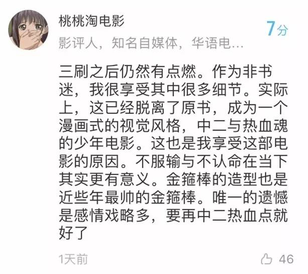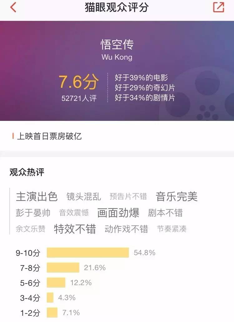 当然,也有为《悟空传》鸣不平,知名影评大号“桃桃淘电影”就发文表示,第一场媒体试片的观感就是很热血中二,很动漫感,3星的片子,比预期的要好;二刷之后,决定给3星半;三刷之后,还是喜欢《悟空传》,猫眼评分给了7分。
