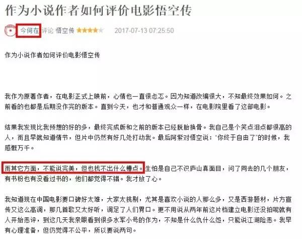 零点首映当天,面对一系列的差评,原作者今何在也坐不住了,开始出来护犊子,在豆瓣发表了一篇长达5000多字的影评《作为小说作者如何评价电影<悟空传>》,但这篇洋洋洒洒的文字也招来了不少质疑。