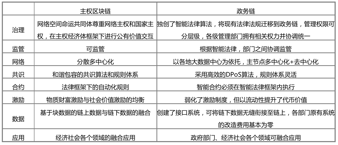 下面我们从技术实现的角度对比主权区块链概念和政务链的共通点。