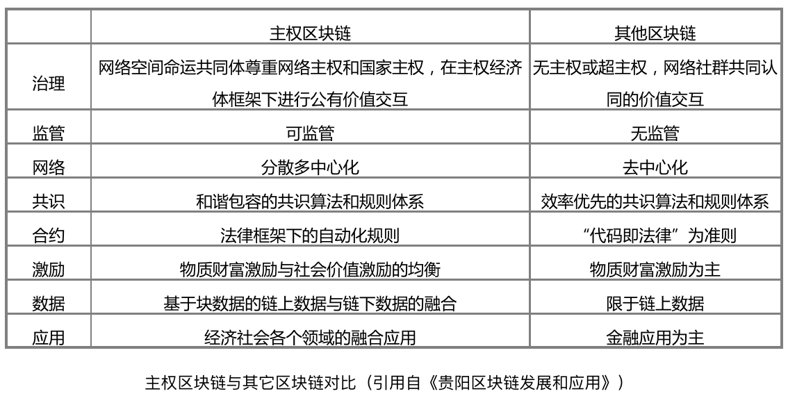 在2016年底,作为国内对区块链研究走在最前沿的贵州省发布了《贵阳区块链发展和应用》白皮书,在白皮书中提出了主权区块链的概念,在这个概念中,主权区块链同其它区块链一样,具有点对点、不可篡改、可信任和价值转移的特点。但不同的是,主权区块链增加了国家主权、政府监管、技术干预、非完全去中心化等注入有主权意志的特性。