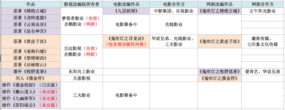 玄霆公司将《鬼吹灯》的影视改编权分为两部分分别出售给梦想者影业与万达影视:第一部分四本书的影视改编权由梦想者影业获得,第二部分四本书的影视改编权由万达影视获得。实际上,对于第一部分的改编权所属,也有众多资料显示是中影集团购得了此部分的改编权,因未获得确切的证据,所以本文在这一问题上持保留意见。