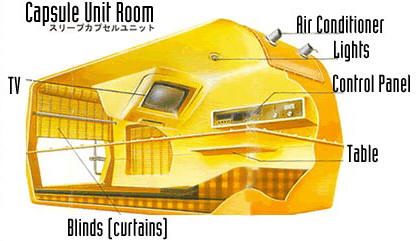 黑川纪章建造的胶囊旅馆是个大小为2米*1米*1.25米的长方体盒子,除了床垫被褥,有的还包括电视、广播、射灯以及灭火装置。最初,这种旅馆只为男性客人提供服务,由于日本高密度的人口条件,一时间,胶囊旅馆成为日本的文化符号,吸引着全球旅行者来充当“窘迫的工薪族”体验。如今,这间胶囊旅馆提供多种“类型”的胶囊:标准胶囊、宽体胶囊,还有适合不同需求的枕头。客人通过手环可以前往更衣室换睡衣,手环就是入住胶囊的钥匙。