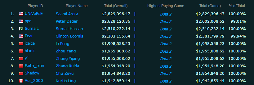 根据Esportsearnings网站统计,TI6冠军队伍中的五名中国选手均进入了奖金收入排行榜的前十名,但他们大部分奖金都来源于TI6。即便所有人都认可了前Wings战队的强大,国内外其他豪强俱乐部的实力也并非不及Wings,但他们却奖金收入上却远远不及这支成立不到3年的“年轻战队”。