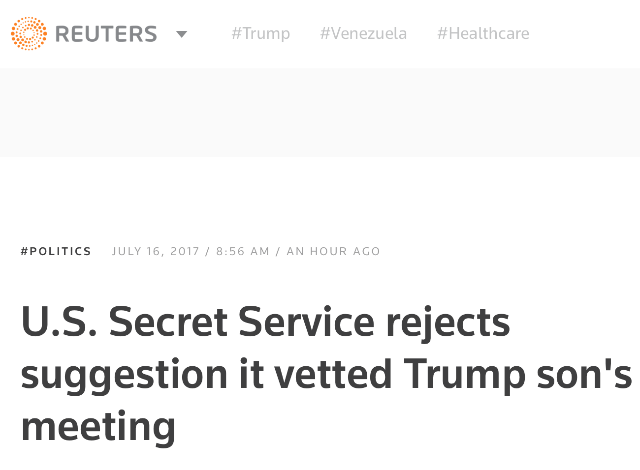 Sekulow说:“如果这次会面是恶意的,我不知道为什么特勤局允许这些人进入。总统在那个时候应该有特勤局的人保护,我对此感到很困惑。”但特勤局发言人在邮件中回应了此言论,否认了当时小特朗普当时受到特勤局保护。