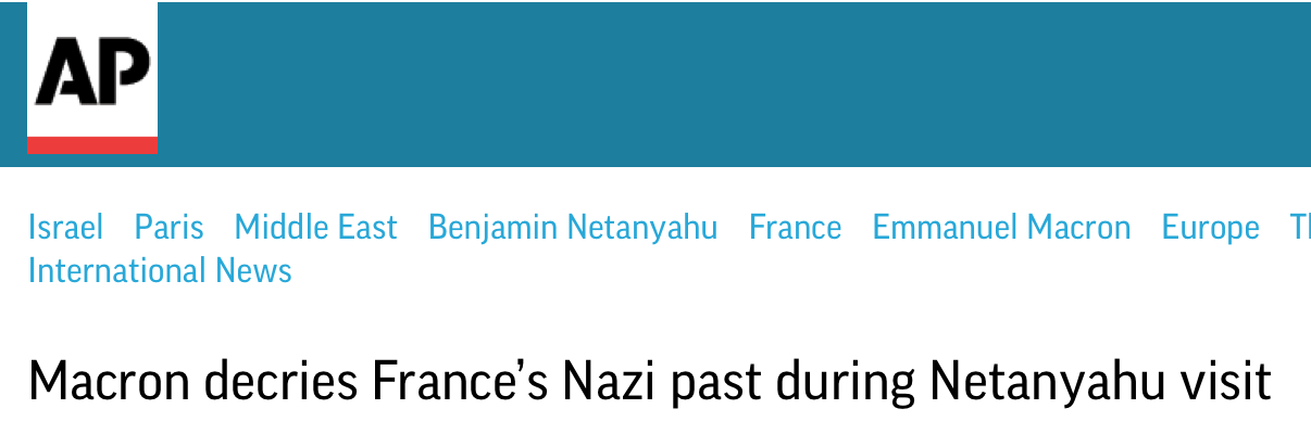 马克龙谴责了二战期间纳粹控制的法国维希政府对犹太人的暴行,驳斥法国极右翼领导人不承认当时的维希傀儡政府代表法国的言论。二战期间,约有76000犹太人被法国驱逐出境送往纳粹集中营。近半个世纪后,当时的法国总统希拉克才首次承认法国在大屠杀中的行为。