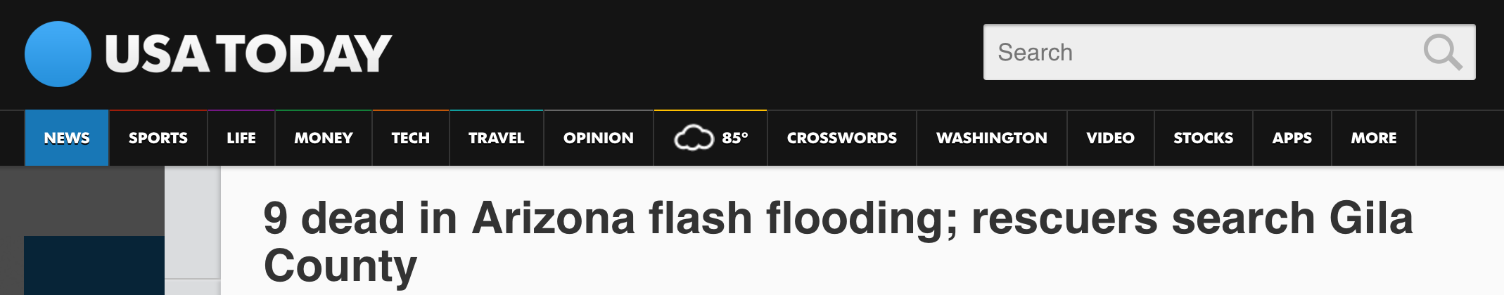 【亚利桑那州突发洪水至少9人死亡】亚利桑那州佩森市一条河流周六突发洪水,目前已造成九人死亡多人失踪。吉拉县警长办公室周日下午接到911电话,星期六在靠近塔托国家森林一处名为Cold Springs的游泳盛地发生突发洪水。