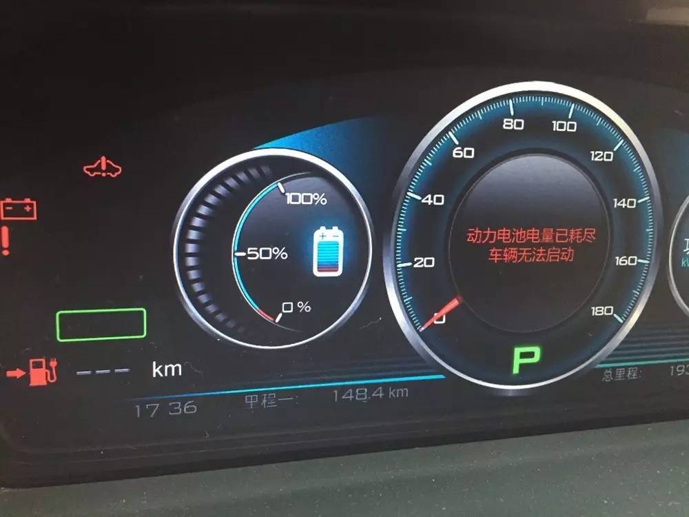 最终,试驾车在实际行驶里程达到148.4公里的时候彻底耗尽了电量,车辆自动切入空挡滑行以便驾驶者完成停靠,仪表上显示出红色字样——动力电池电量已耗尽,车辆无法启动。