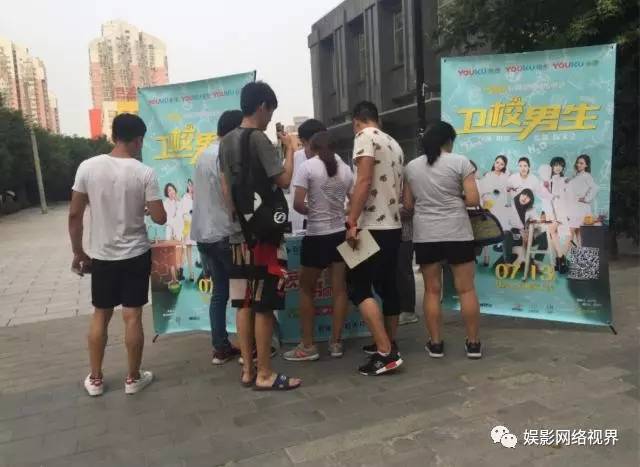 社区中,居民看到穿着护士服、拿着针筒并携带礼品的推广人员以及悬挂《卫校男生》个性海报的展架,也会好奇地围拢上来,参加扫码推广活动。