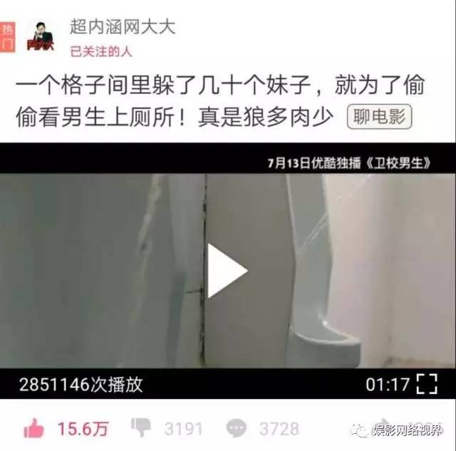 7月13日下午,《卫校男生》正式上线,从弹幕和评论可以看到,大量“内涵段子”app用户即“段友”前来围观,他们都是自发通过直接搜索片名而来,影片大量的有效播放,正是来自于他们。弹幕和评论中“天王盖地虎”这一“段友”标志性留言不断涌现,甚至有很多弹幕认为这部“有内涵”“笑点多”的网络电影是出自“段友”之手。
