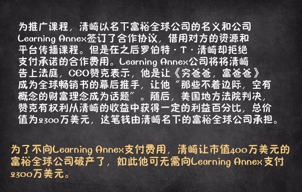 了解秘辛的人会知道清崎的公司破产绝对不是经营不善,而是他高超的财商又一次完美发挥。但从人格上来讲,他这一行为让人非常不齿。破产400万美元的公司以拒绝支付2300费用,足足挣了1900万美元,挣了钱丢了信誉。那么富爸爸和穷爸爸还值得读吗?