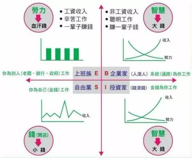上班族:为别人挣钱。没有资源也没有钱,努力上班,不跳脱出靠工资吃饭的模式将永远一辈子幸苦赚钱。