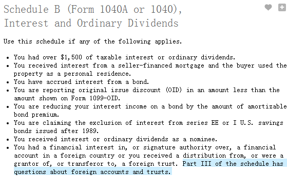 除了全球收入,国税局还关注纳税人在世界任何地方的账户,因此,你必须在税表上申报你是否有任何外国银行或投资账户——通过勾选1040表格(或1040A表格)的明细表B中第三部分的项目进行申报。