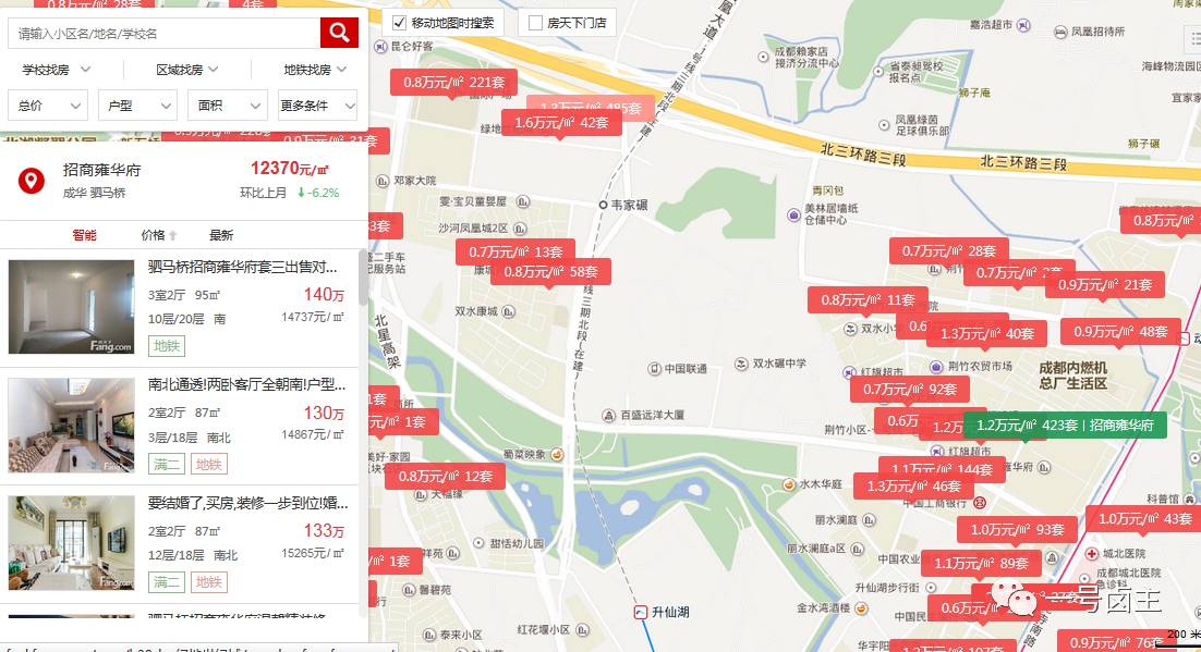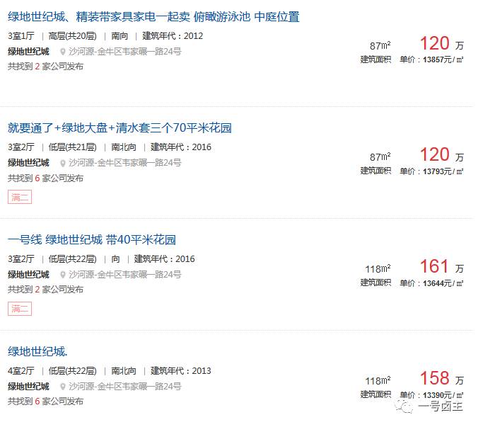 2、搜房网房天下成都绿地世纪城小区二手房均价显示为12903元/㎡,逼近1.3万大关,环比上月上涨↑8.47%!均价超过了成都市平均水平,在所属的沙河源商圈中处于领跑的水平。