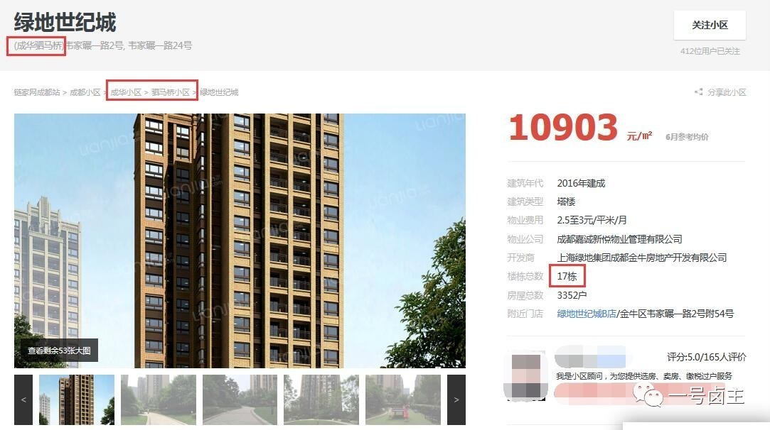 3、作为二手房市场的大咖,链家网成都绿地世纪城小区均价只有10903元/平米。但卤主个人认为,数据偏低,而且所属区县划分为了成华区、商圈为驷马桥、楼栋一共是17栋均为错误。应分别为金牛区、沙河源、18栋(没有1栋,2-19栋)